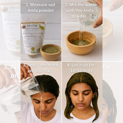 • Hair Mask: Mix Amla Powder with water or yoghurt to form a paste. Apply to scalp and hair, leave for 20-30 minutes, then rinse.