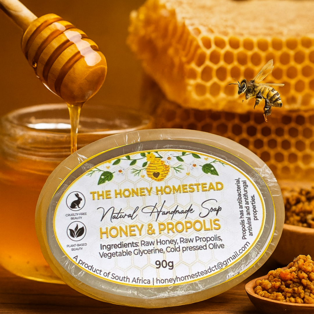 Experience the soothing touch of nature with The Honey Homestead Honey & Propolis Soap, handmade using raw honey, raw propolis, vegetable glycerine, and cold-pressed olive oil. Each bar is packed with skin-loving ingredients straight from the hive and earth, offering a gentle yet effective cleanse for all skin types.